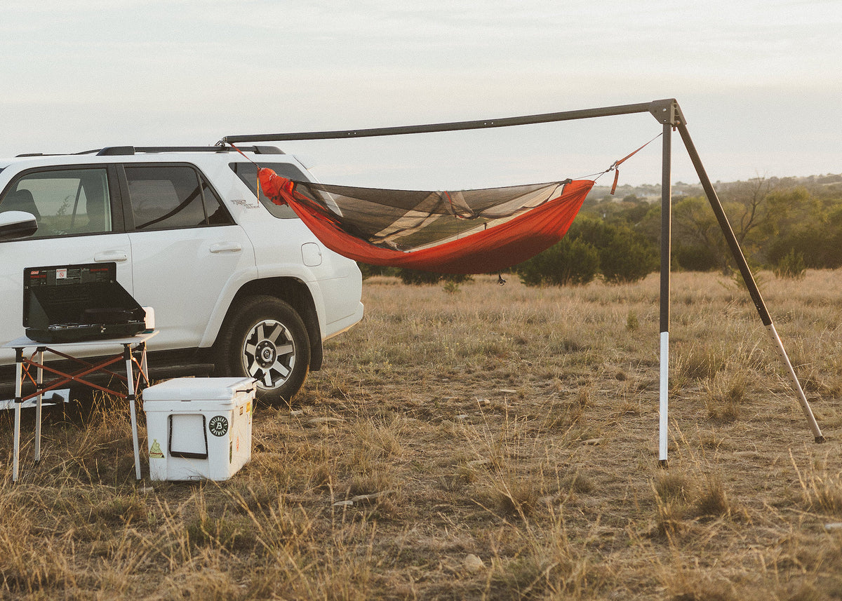 Vehiclesupported hammock stand pitches base camp in seconds . Compact for travel and over 12 ft long for full-length hammock camping, the Outpost sets up in seconds to camp in any terrain. 15210 Fitzhugh Road #600 Austin, TX 78736-6321 Products